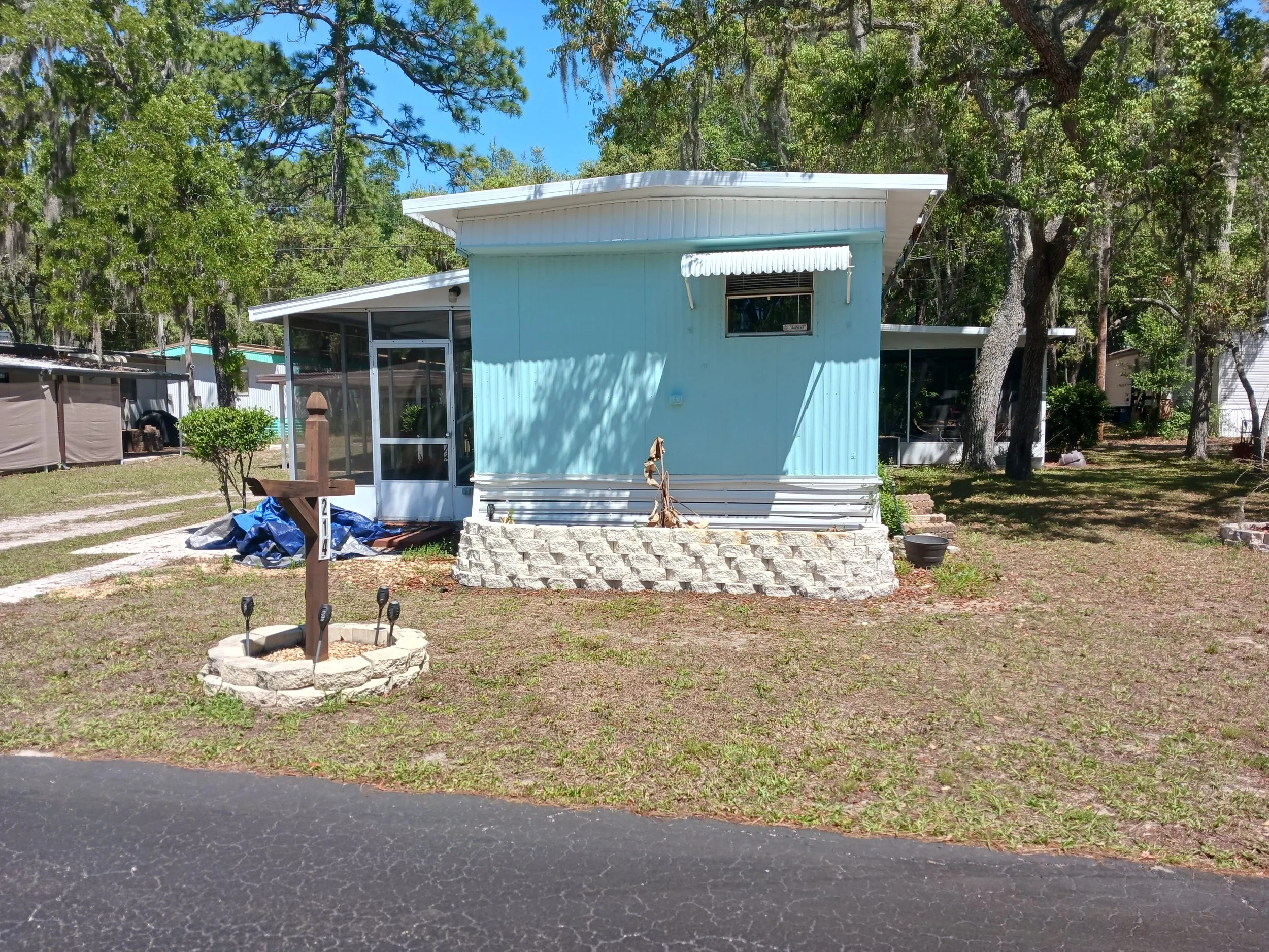 For sale, comfortable RV in permanent setting at lovely Ridge Manor Campground and Mobile Home Park, located less than 5 miles from I-75 interchange with Florida 50 (Cortez Blvd). Many activities for those over 55. The clubhouse hosts nightly games throughout the week; potluck meals happen several times each month. A large pavilion under the trees is the location for frequent cookouts, bonfires, and karaoke. Lot 15 is very close to the office, clubhouse, bathrooms/showers, laundry facilities, and mailroom with pool table! Shady with convenient parking for one car. 35 foot long, with plenty of storage, this sturdy 2008 model is perfect for singles or couples. New in 2023: heavy duty vinyl tile flooring throughout; interior painting; full size oven/four burner stove; ceiling fan in Florida room; LG window air-conditioners in bedroom and living room; extra cabinets in kitchen; subway tiling in kitchen; microwave; raised planter boxes and trellis, extended porch roof; micro-irrigation system New in 2024: exterior storage shed has two doors for easy access to shelving, water heater; screened in porch with ceiling fan and door to patio area; second layer over roof. One bedroom (Queen size) with window unit; ceiling fan; storage cabinets above bed; full height closet and storage shelves. Kitchen; full size propane stove, full size refrigerator (older); corner sink with adjustable spray; closed bottom cabinets and drawers; upper open shelves for dishes. Living /dining area; window air conditioning and storage cabinets above sofa area. Florida room with 1890s stained glass window, ceiling fan. Bathroom with walk in shower, bidet. Screened in porch with dog/cat access door; ceiling fan; second door out to patio. Extended porch over front door; raised garden beds and trellis; irrigation system. Large attached shed for seasonal storage; two doors for easy access. This is a family-owned campground, with plenty of trees, in what is still a rural area of Florida. Nearby Brooksville, Bushnell and Dade City provide plenty of general shopping and dining options. Asking price of $19000 but open to negotiation!